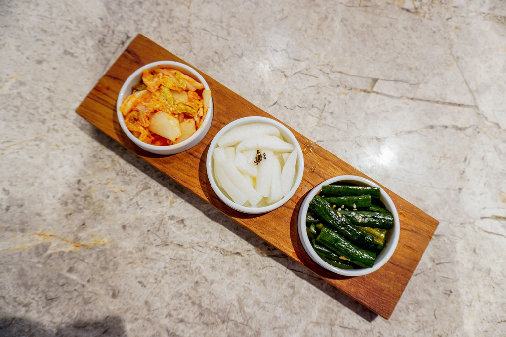 點完菜之後,店員先端上了三個小菜:泡菜/醃蘿蔔/醃小黃瓜